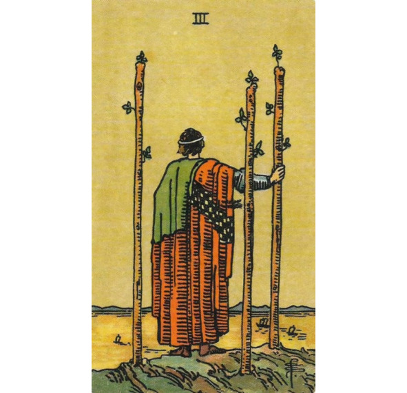 Символы: Человек стоит на возвышенности, смотрит вдаль на море, где видны корабли. Он держит один из трёх жезлов. Это символ ожидания результата, предвидения и уверенного прогресса.