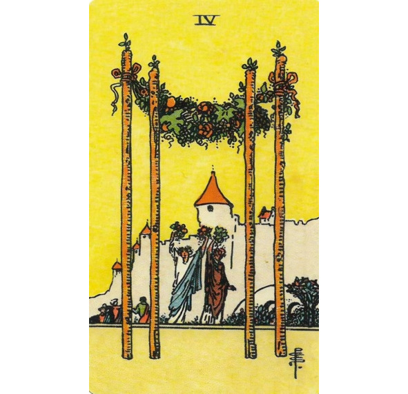 Глифы и детали: Четыре жезла, стоящие прочно – стабильность, основа, структура. Люди с поднятыми руками – благодарность, празднование.