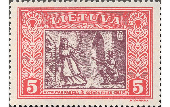 Вялікі Князь Літоўскі Вітаўт зьбягае з Крэўскага замку (1382). Марка пошты Летувы, выдадзеная ў 1932