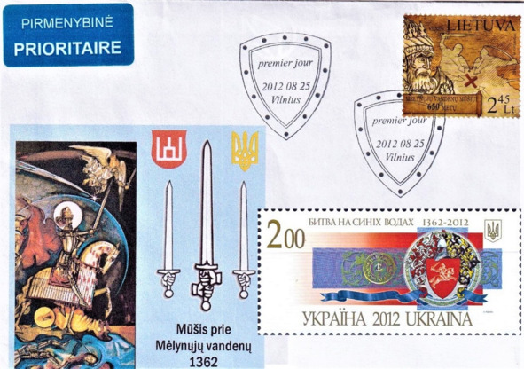 Бітва на Сініх Водах (1362). Канвэрт першага дня, выдадзены поштай Летувы ў 2012 і марка пошты Украіны, выдадзеная ў 2012