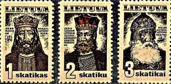 Кароль Літвы Міндоўг, Вялікі Князь Літоўскі Гедымін, Вялікі Князь Літоўскі Кейстут. Маркі пошты Летувы, выдадзенгыя ў 1920