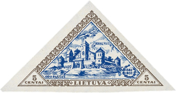 Тракайскі замак, пабудаваны Кейстутам. Марка пошты Летувы, выдадзеная ў 1932