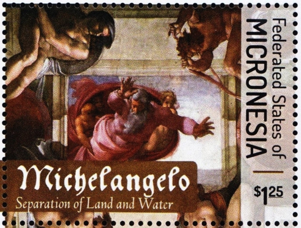 Аддзяленьне цьвердзі ад вады. Мікеланджэла (1475—1564). Фрагмэнті. Сікстынская капэла (1508—1512). Ватыкан. Марка пошты Мікранезіі, выдадзеная ў 2012 годзе