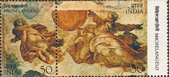 Стварэньне сьвяціл. Мікеланджэла (1475—1564). Фрагмэнт. Сікстынская капэла (1508—1512). Ватыкан. Марка пошты Індыі, выдадзеная ў 1975 годзе