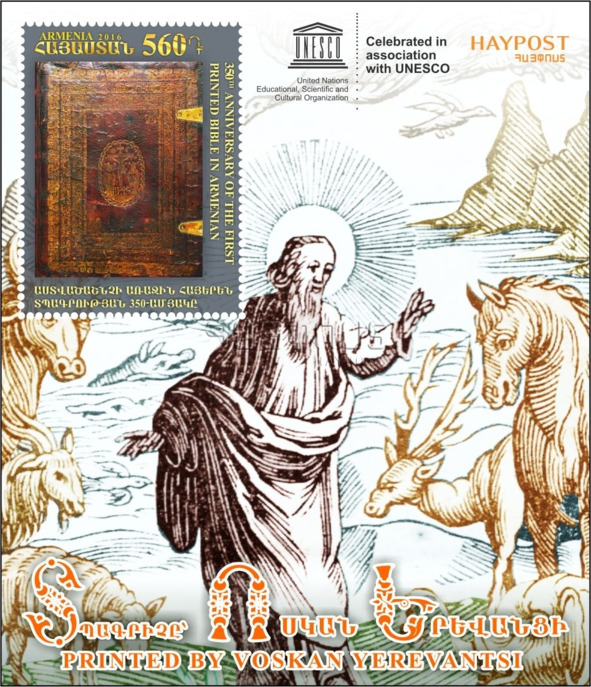 Ілюстрацыя. Блёк пошты Арменіі, выдадзены ў 2016 годзе з нагоды 350 гадавіны Першай Бібліі на армянскай мове