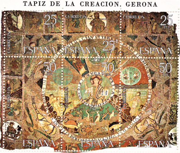 На блёку, выданым поштай Гішпаніі ў 1980 годзе, зьмешчана рэпрадукцыя знакамітага «Габэлену Стварэньня» 11 ст. Габэлен «Стварэньня сьвету» – адзін з самых загадкавых помнікаў эпохі эўрапейскай раманікі. Гэта незвычайна каштоўны і прыгожы твор мастацтва, які захоўваецца ў катэдры гішпанскага месца Верона. Узор у выглядзе круга паказвае розныя сцэны Стварэньня Сьвету і чалавека. Зьмяшчае таксама цытаты на лацінскай мове з Кнігі Быцьця. Круг у сярэдзіне зьмяшчае выяву Бога Стваральніка. Вакол круга надпіс: «І сказаў Бог: хай будзе сьвятло. І сталася сьвятло» (Быцьцё 1:3). Над цэнтральным кругам на 11 гадзін самы цёмны сэктар, прысьвечаны «цемры над безданьню» перад пачаткам Стварэньня. Наступны сэктар (на 12 гадзін) Дух Божы над водамі. Справа ад яго – Стварэньне Сьвету. Сымэтрычныя сэктары па «экватары»: «хай будзе цьвердзь» і «аддзяліў ваду». Самы большы ніжні сэктар – Стварэньне істот водных і птушак. Па бакам гэтага сэктару – Стварэньне жывёл і чалавека і Стварэньне жанчыны.