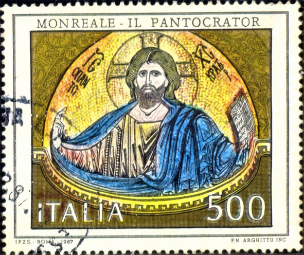 Хрыстос Пантакратар. Мазаіка сабора ў Чефалу, Сіцылія (1140). Марка рошты Италіі, выдадзеная ў 1987 годзе