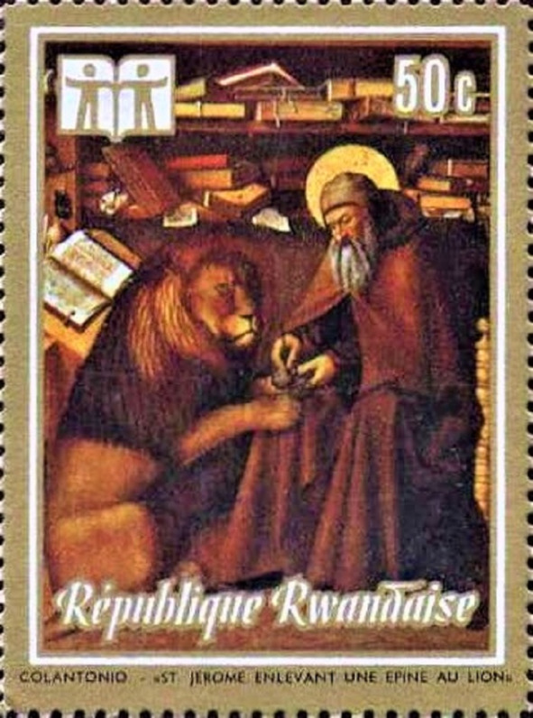 Сьвяты Геранім за працай (1440—1470). Нікало Антоніа Калянтоніё (1420—1460). Нэапаль, Музэй Кападымонтэ. Марка пошты Руанды, выдадзеная ў 1973 годзе