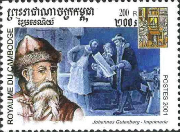 Іяган Гутэнбэрг – друкарня. Марка пошты Камбоджы, выдадзеная ў 2001 годзе