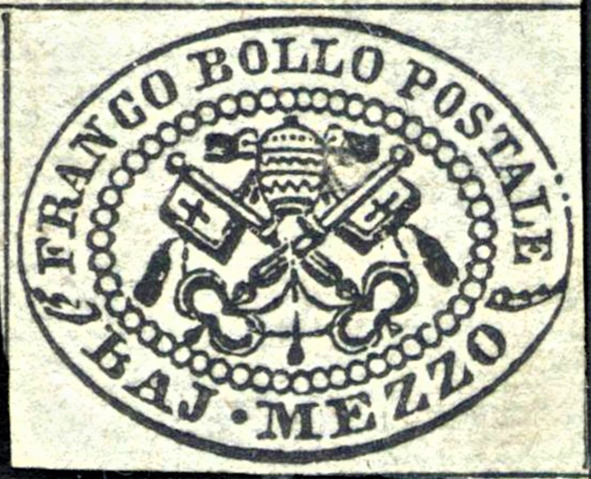 Герб Папы Рымскага. Марка №1 пошты Італіі, выдадзеная ў 1852 годзе