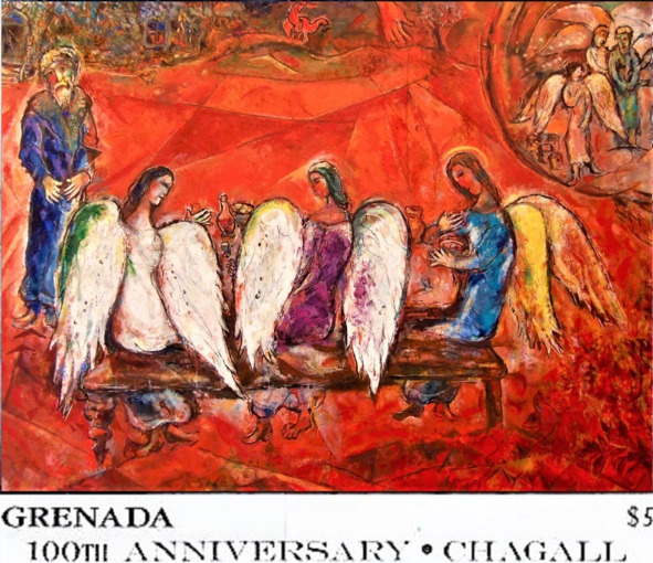 Абрагам і тры Анёла (1966). Марк Шагал (1887—1985). Нацыянальны музэй «Біблейскае пасланьне Марка Шагала», Ніца. Блёк пошты Гранады, выдадзены ў 1986 годзе