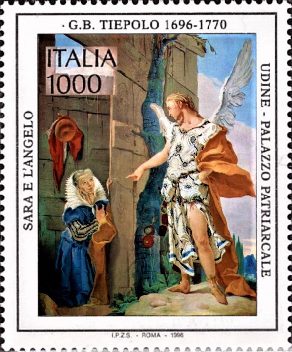 Зьяўленьне Анёла перад Саррай (1726—1728). Джавані Батыста Тьепола (1696—1770). Фрэска. Арцыбіскупскі палац, Удына, Італія. Марка пошты Італіі, выдадзеная ў 1996 годзе