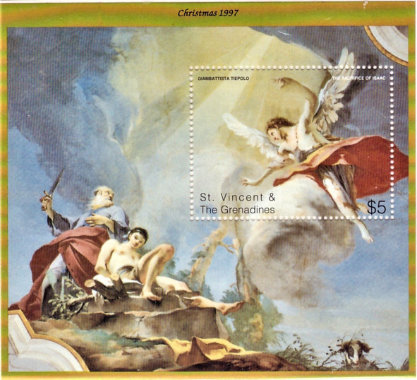 Ахвярапрынашэньне Ісаака (1716). Джавані Батыста Т'епола (1696—1770). Арцыбіскупскі палац, Удына. Блёк пошты Сэнт Вінсэнт і Грэнадыны, выдадзены ў 1997 годзе