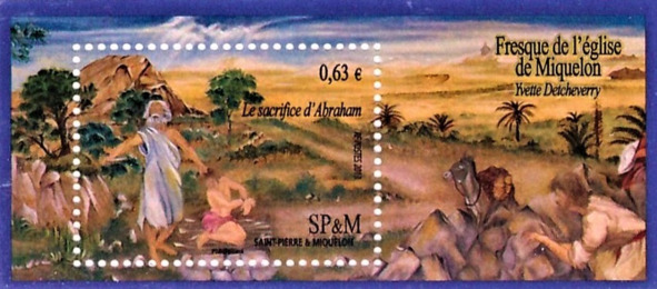Ахвяраваньне Ісаака Абрагамам. Фрэска Мікелонскай царквы (2002). Івет Дэтшэвэры. Марка пошты Сен-Пер і Міквэлон, выдадзеная ў 2013 годзе