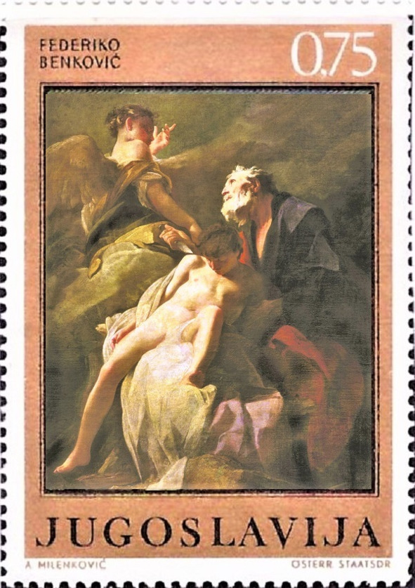 Ахвяраваньне Ісаака Абрагамам (1716). Фэдэріко Бэнковіч (1677—1753). Галярэя Даўніх Майстроў, Загрэб. Марка пошты Югаславіі, выдадзеная ў 1970 годзе