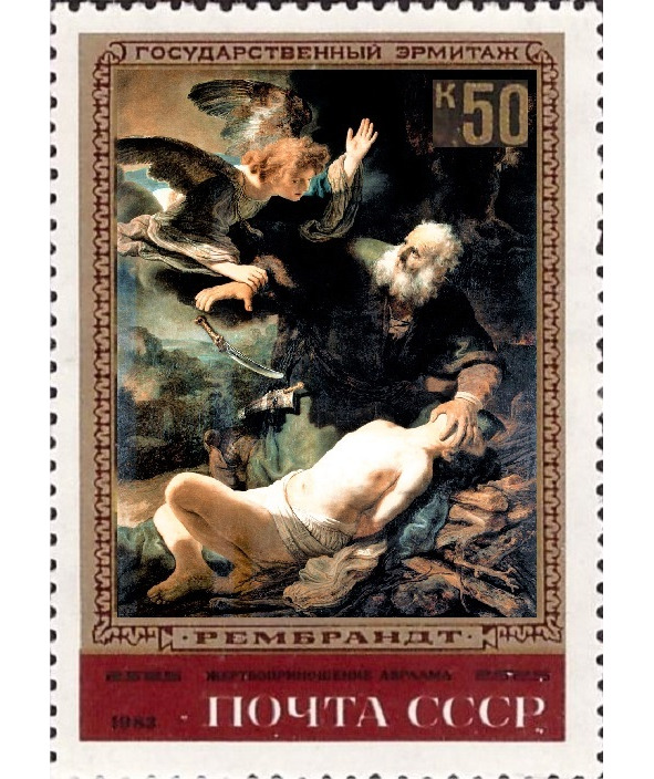 Ахвярапрынашэньне Ісаака (1635). Рэмбрандт (1606—1669). Эрмітаж, Петраград. Марка пошты СССР, выдадзеная ў 1983 годзе