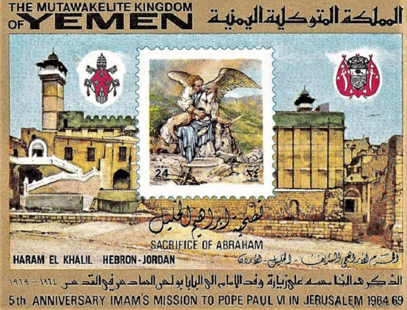 Ахвярапрынашэньня Абрагама. Храм над Пячорай Махпела. Блёк пошты Каралеўства Емен, выдадзены ў 1969 годзе