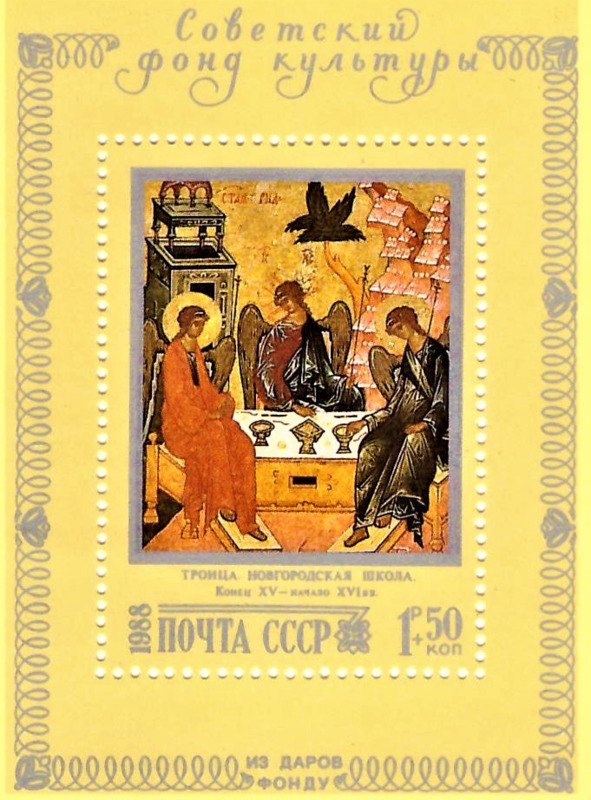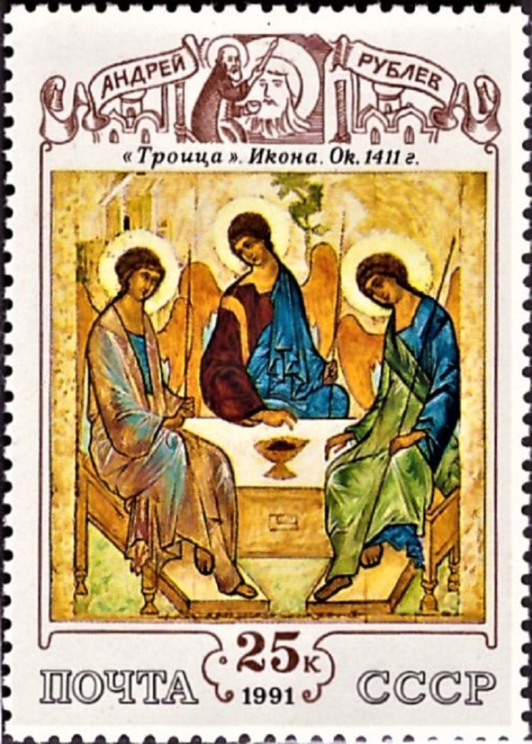 Сьвятая Троіца (1411). Ікона. Андрэй Рублёў (1375/80—1428). Дзяржаўная Трацьцякоўская галерэя, Масква. Марка пошты СССР, выдадзеная ў 1991 годзе
