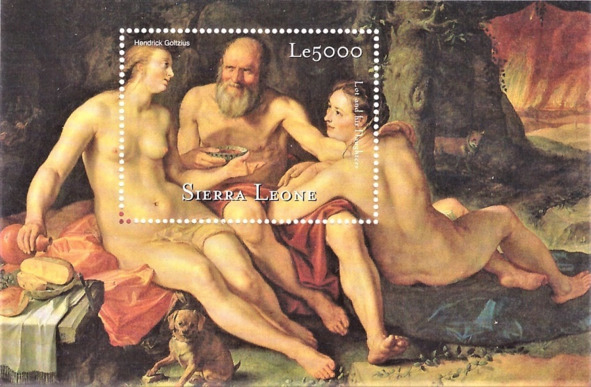 Лот і яго дачкі (1616). Хендрык Гольцыус (1558-1616-1617?). Блёк пошты Сьера Леонэ, выдадзены ў 2001 годзе
