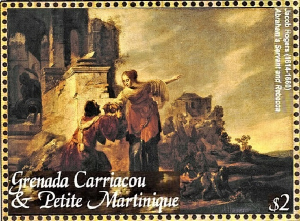 Эліязэр і Рэбэка ля студні (1653). Якаў Хогерс (1614 – 1660). Эрмітаж. Марка пошты Грэнады Карыяку і Петыт-Марцінікі, выдадзеная ў 2003 годзе