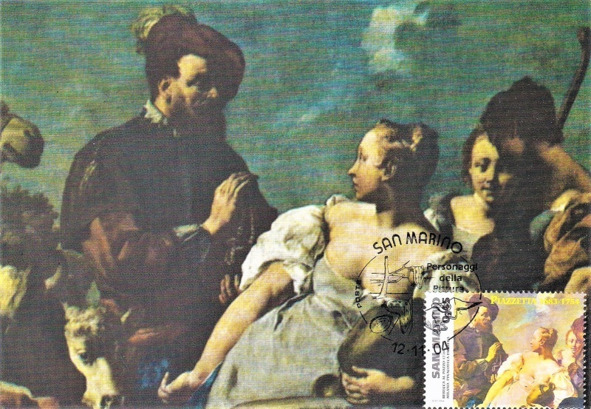 Рэбэка і Эліязэр ля калодзежа (1740). Джавані Батыста Пьяцета (1683—1754). Мастацкі музэй Брэра ў Мілане (Італія). Марка пошты Сан-Марына, выдадзеная ў 2004 годзе