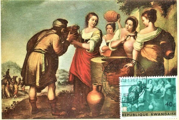 Рэбэка і Эліязэр (1660). Барталамэ Мурыльё (1617—1682). Музэй Прада. Картмаксімум пошты Руанды, выдадзены ў 1967 годзе