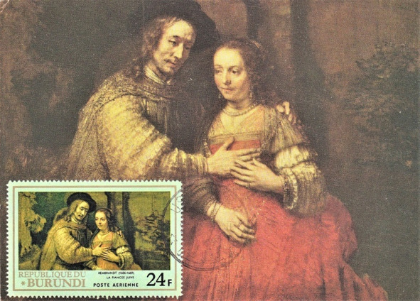 Габрэйская нявеста (1665). Рэмбрандт (1606—1669). Рейксмузэум, Амстэрдам. Картмаксімум пошты Бурундзі, выдадзены ў 1968 годзе