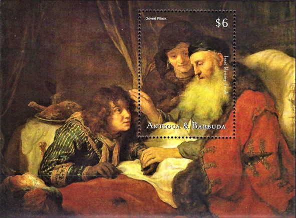 Дабраславеньне Якава Ісаакам (1638). Гаверт Флінк,. Рыксмузэум, Амстэрдам. Блёк пошты краіны Антыгуа і Барбуда, выдадзены ў 2000 годзе