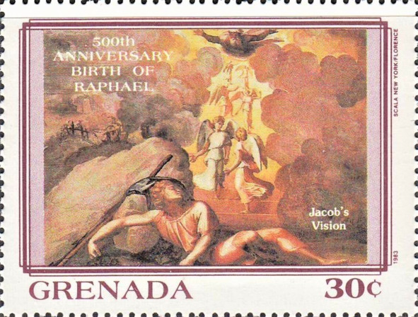Сон Якава (Лесьвіца Якава). Фрэска лоджыі Рафаэля. Музэі Ватыкана, Рым. Марка пошты Грэнады, выдадзеная ў 1983 годзе