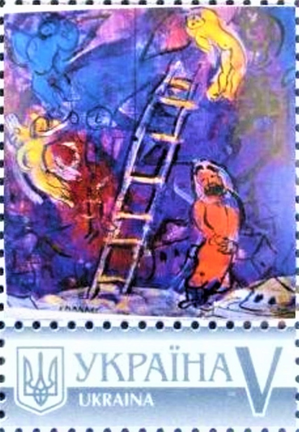 Сон Якава (1963). Фрагмэнт. Марк Шагал. Ніца. Нацыянальны музэй Біблейскага пасланьня Марка Шагала. Пэрсанальная марка, выдадзеная поштай Украіны ў 2018 годзе