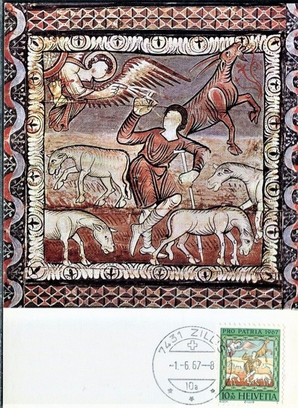 Якаў з стадам Лавана (12 ст.). Царква Сьвятога Марціна, Зіліс. Картмаксімум пошты Швайцарыі, выдадзены ў 1967 годзе