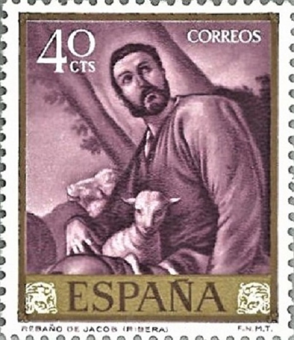 Якаў са статкам Лавана (1638). Фрагмэнт. Хусэпэ дэ Рыбера (1591 – 1652). Музэй Серральбо, Мадрыд. Марка пошты Гішпаніі, выдадзеная ў 1963 годзе
