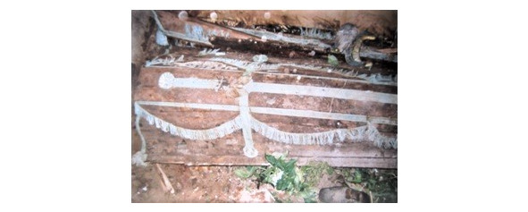Здымак труны з фамільнага склепу Чахоўскіх ля Луненскага касьцёла.