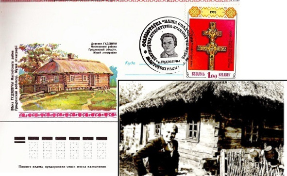 Сялянская хата (канец 18 ст.). Гудзеўскі музэй. Канверт (1984). Фота Алесь Белакоз ля сялянскай хаткі.