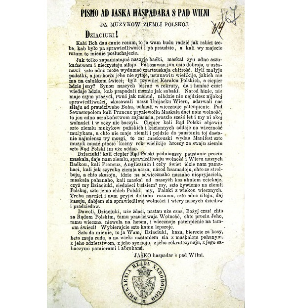 «Дзяцюкі, – зьвяртаецца К. Каліноўскі да сялян – Жывучы пад рондам маскоўскім, кожны ведае, што ён нас абдзірае і глуміць, но мала хто добра падумаў, чы можна ад яго спадзяваціся чаго-лень для нас альбо для дзяцей нашых?» І ў канцы пісьма: «Так з гэтага пісьма і відна: што няма чаго ждаці ад нікога, бо той толькі жне, хто пасее. Дык сейце ж, Дзяцюкі, як прыйдзе пара, поўнаю рукою, не шкадуйце працы – каб і мужык быў чалавекам вольным, як е на цалюткім сьвеце. Бог нам дапаможа!!!