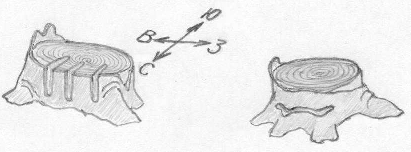 Рис. 2 и Фото 7. Наиболее простой способ выращивания вешенки без затрат – это использование свежесрубленных пней в лесополосах и садах. Чтобы собирать урожай несколько лет подряд, необходимо лишь выбрать свежий пень, желательно с признаками сокодвижения, сделать надпилы с северной стороны, заложить в них мицелий и укрыть от солнца и ветра (ветками, соломой или землёй). При наступлении грибного сезона (влажно и не жарко) ветки можно убрать. Если пень инокулировали мицелием весной, то осенью у вас уже могут вырасти несколько первых грибов. Есть ещё более простой способ – свежесрубленный пень засыпать использованным субстратом или ждать, когда споры грибов надует ветром. Хотя вероятность получения желаемого урожая снижается, но затрат практически никаких.