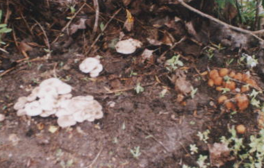 На фотографии видно плодоношение вешенки на засыпанном землёй пне тополя. Сбоку вышла семейка серого навозника