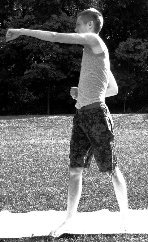 Левое плечо и локоть отводятся назад, кисть в кулак не сжимается (рис. 1.1).