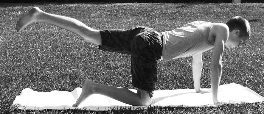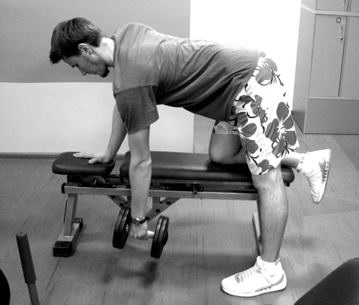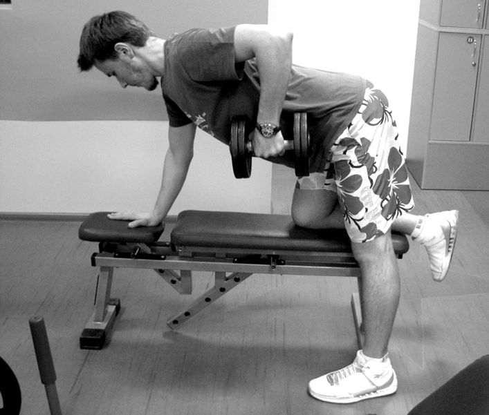 1. Исходное положение: ладонью и коленом опираемся на скамью, слегка наклонив корпус, но не сутулясь. Вторая нога на полу – выбрать максимально – устойчивую позицию.