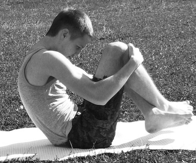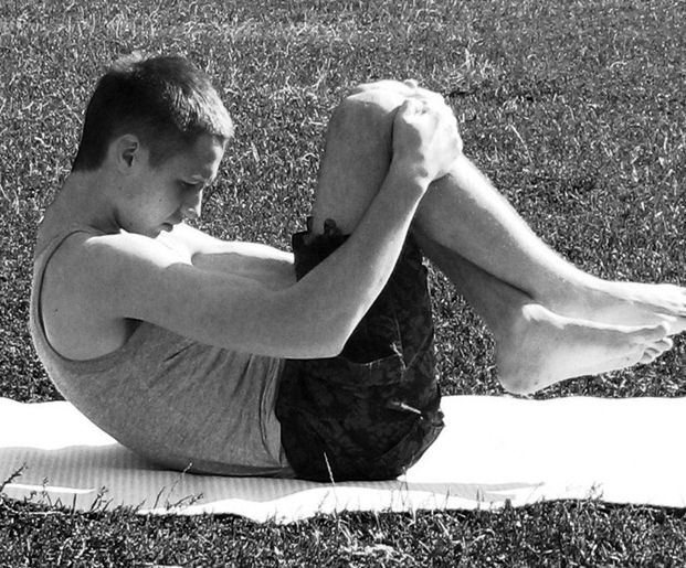 Выполнение: на выдохе – максимально сжаться, наклоняясь корпусом вперед, приняв позу плода в утробе матери. Задержаться в этом положении на несколько секунд.