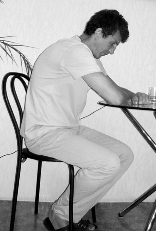 Исходное положение: сидя за столом, опустить руки вниз, принимая положение кучера. Ноги прижаты к полу (рис. 1.18).