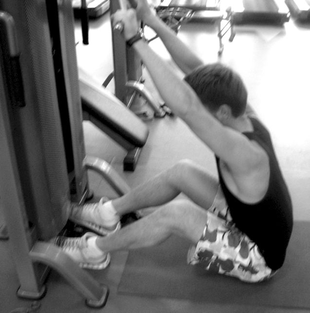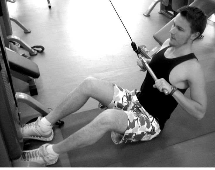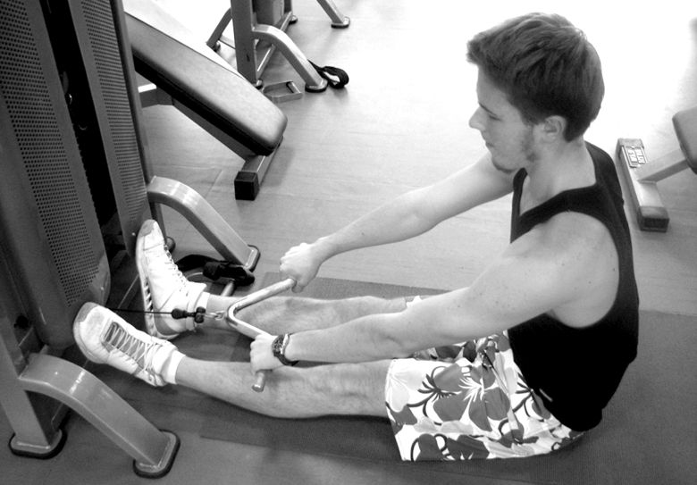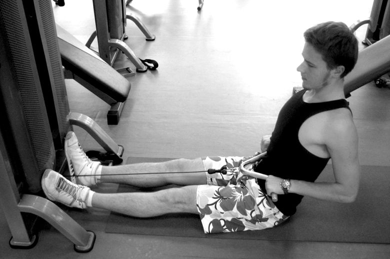 Второе универсальное упражнение в зале1. Исходное положение: сидя на полу, упор ногами в ножки тренажера.