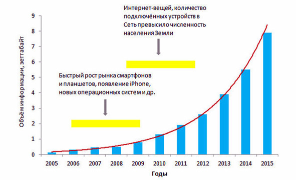 Рост объёма информации в Интернет. С 2008 года быстрый рост данных связан с появлением многофункциональных персональных устройств с возможностью передачи видеофайлов. С 2010 года ускорение происходит за счёт технологии интернет-вещей и инструментов социальных сетей.