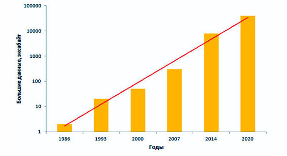 В начале XXI века произошла цифровая революция – перенос данных из аналогового в цифровой формат. Если в 2000 году три четверти всех данных в мире содержалось в аналоговых форматах, то спустя семь лет 94% данных уже хранилось в цифровом виде. Общий объём хранимых данных с 1986 до 2007 года составил 295 эксабайт (ЭБ), а к 2009 году объём данных в Интернет приблизился к отметке 500 ЭБ. В 2011 году общий мировой объём созданных и реплицированных данных составил более 1,8 зеттабайт (ЗБ). Тем самым, объём Цифровой Вселенной каждые два года расширяется в два раза.