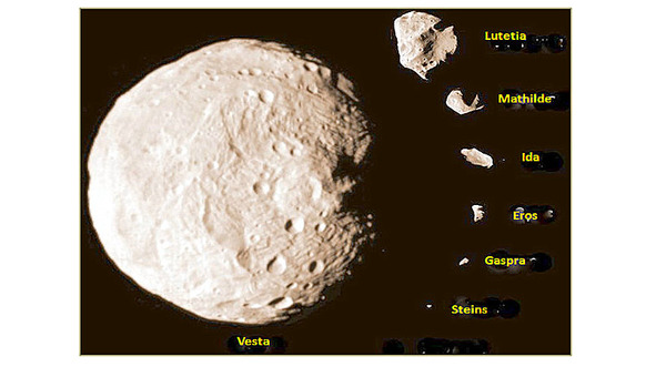 Соотношение размеров самых крупных объектов обнаруженных в Главном поясе астероидов, от крупнейшего (4) Vesta диаметром 525 км до относительно небольшого астероида (2867) Steins в 6,8 км.