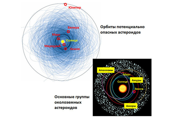 Орбиты известных потенциально опасных астероидов (голубой цвет) размером более 140 метров на расстоянии до 7,6 млн. км от Земли (2013) и подразделение их на группы в зависимости расположения орбит относительно Солнца.