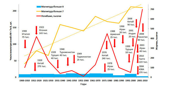 Общее число жертв и сейсмическая активность по десятилетним интервалам времени. Стрелками отмечены землетрясения с наибольшим количеством жертв. Гистограммой внизу показано число мегалоземлетрясений определяющих основную сейсмическую энергетику планеты. Пунктирная линия с линейным трендом это число зарегистрированных землетрясений с магнитудой около шести по шкале Рихтера. Положительный тренд характеризует увеличение разрешающей способности мировой системы сейсмических наблюдений, а не увеличение сейсмической активности Земли. Первый этап 1900—1930 гг. – становление телесейсмических наблюдений. Второй этап 1930—1980 гг. – создание региональных систем и сетей для слежения за ядерными испытаниями. Третий этап 1980—2010 гг. – появление цифровых сейсмических станций и использование ЭВМ для обработки данных. Квазипериодические флуктуации с повторением в среднем 20 лет с вокруг тренда, видимо, связаны с природными факторами (Каррыев,2016).
