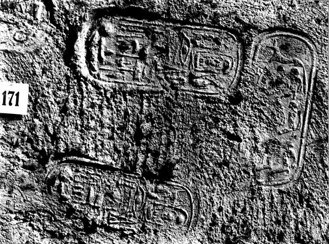 Печати на входе. Правый оттиск с различимым шакалом сверху упоминает девять луков. Верхняя печать с картушем и тронным именем Тутанхамона