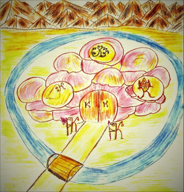 Страна Ка располагалась среди крутых гор на красивой равнине, где постоянно цвели красные тюльпаны и порхали маленькие птички колибри, собирающие нектар с цветов. Айя и Дай попали в страну Ка, пройдя через тоннель в горах, и сейчас они стояли на краю равнины и любовались её красотами. В центре равнины дети увидели большую каменную крепость с колоннами, окружённую каналом с водой. Братик с сестричкой по каменистой дороге дошли до крепостных ворот, возле которых стояли буквы-часовые К в доспехах и с кривыми мечами. Айя, подойдя к ним, поздоровалась и спросила: