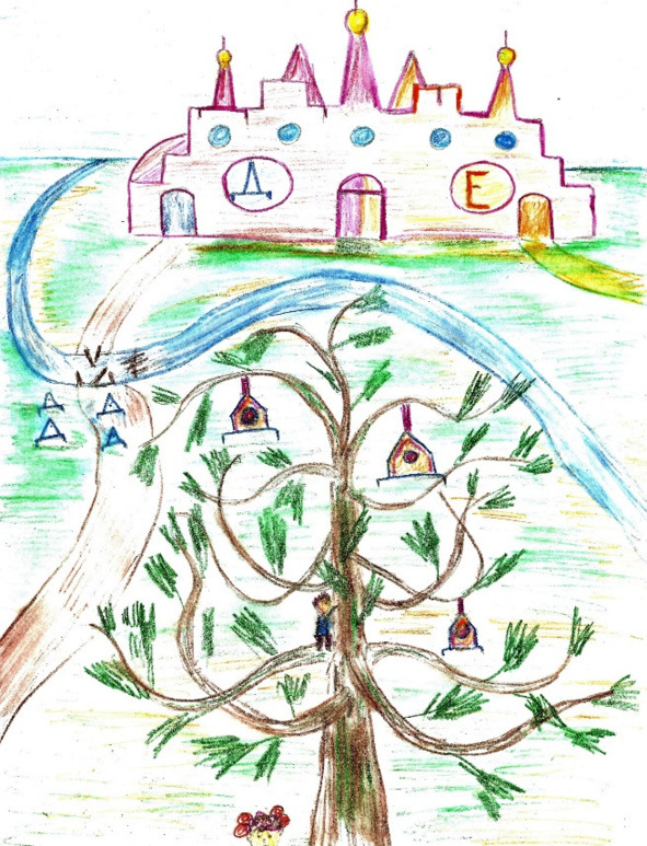 Вдоль дороги росли огромные дубы, на ветках которых у букв Д были построены красивые домики. Возле одного из деревьев Айя и Дай увидели, как две маленькие буквы д пытались что-то поднять с земли. Девочка подошла к ним и улыбнулась.